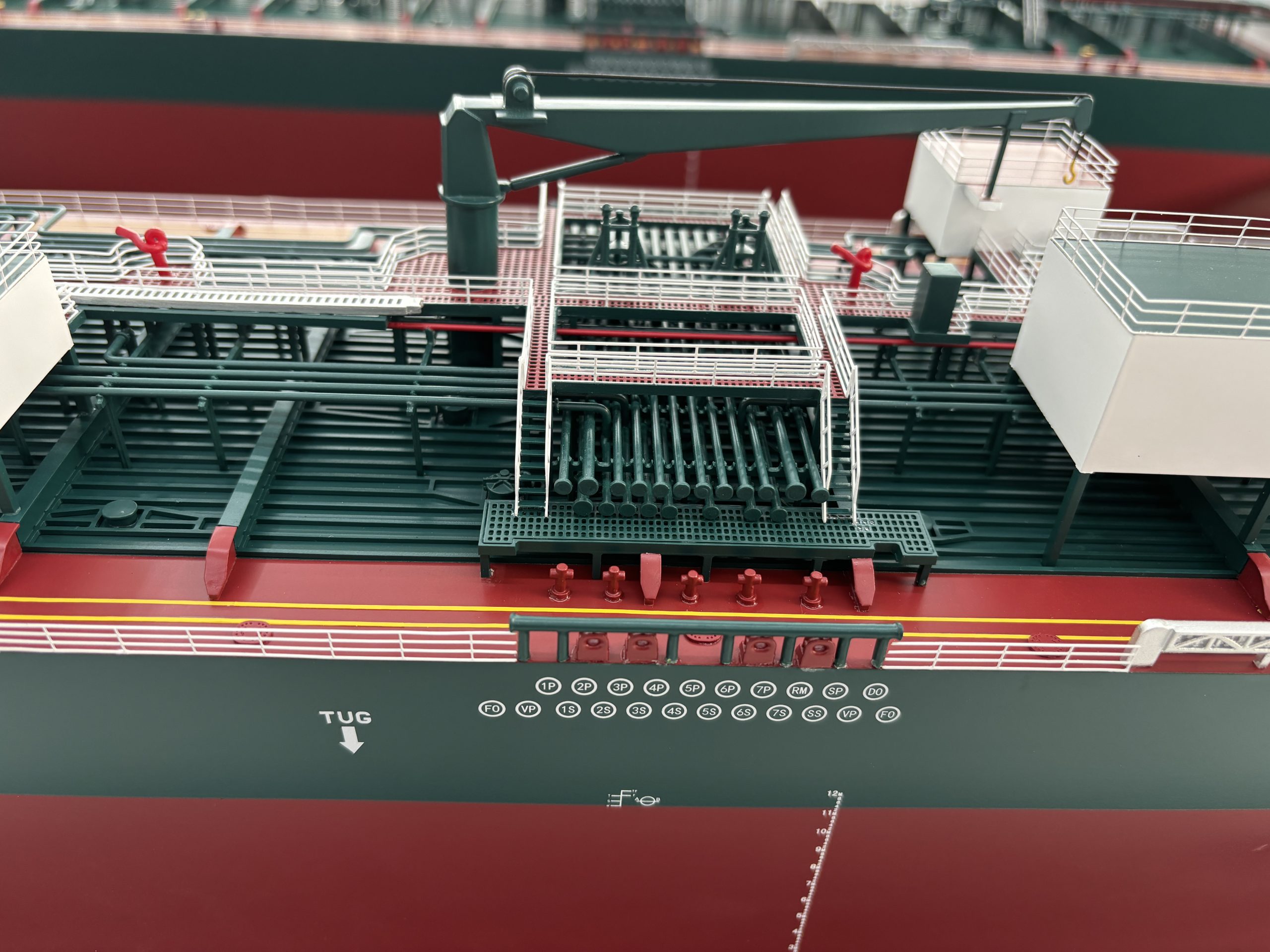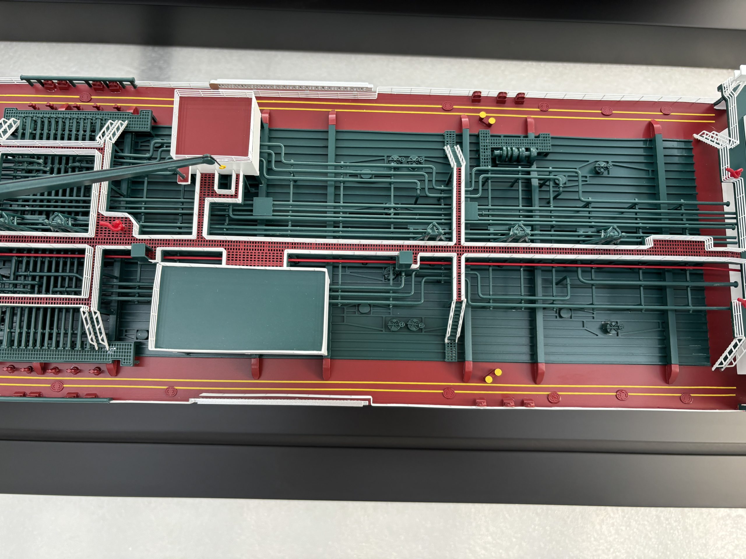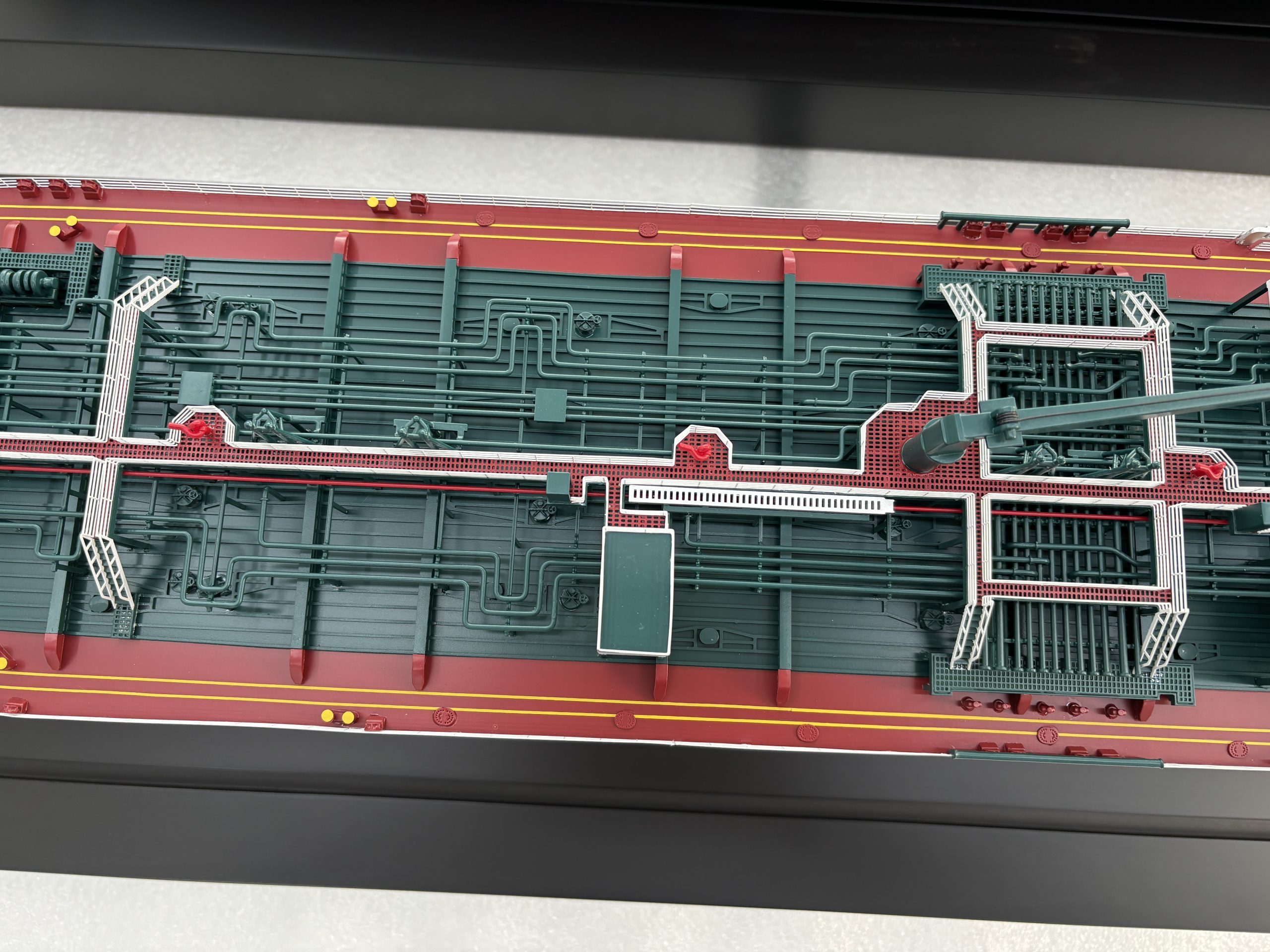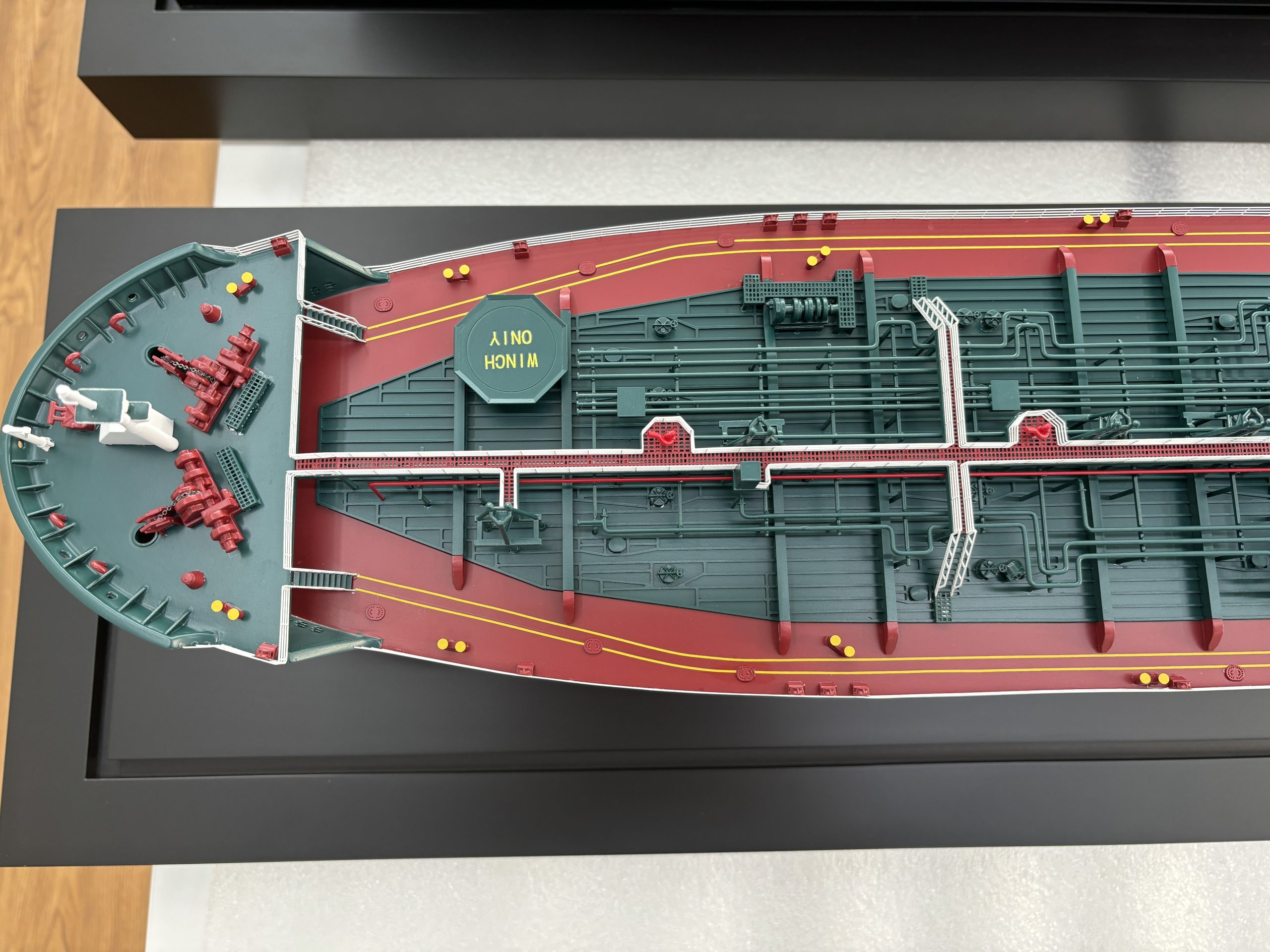 Painting was carried out with exceptional attention to detail to achieve a flawless, premium finish. The hull was finished in a rich maroon, while the main body featured bold green and black tones. Extensive areas of the deck were painted white, complemented by smaller blue and red details. In the final stage, the model was carefully cleaned and polished to a high-gloss finish, and the base was completed with a bespoke wooden nameplate.