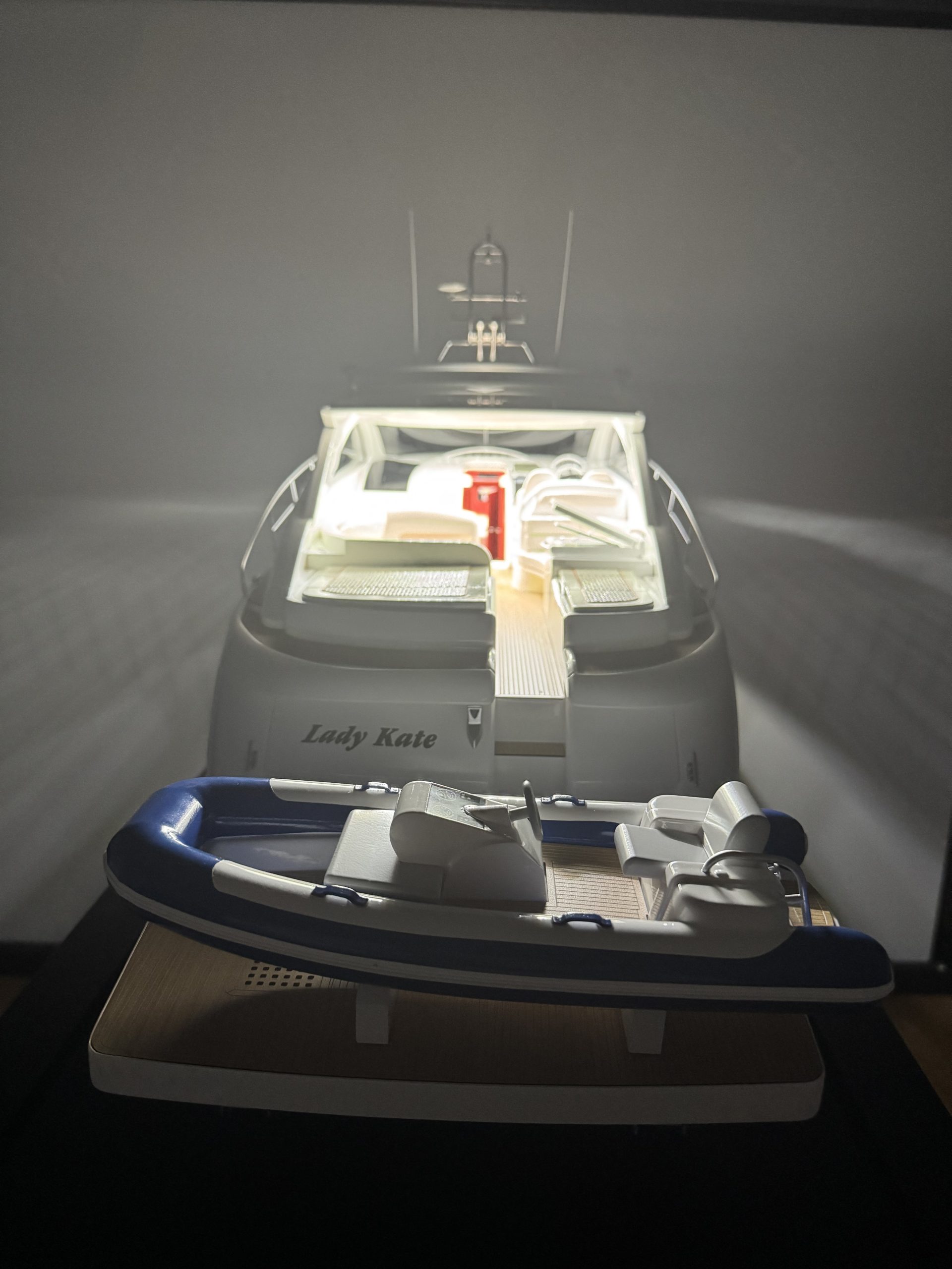 The build began with the creation of the base, forming the structural foundation of the model. This stage required meticulous measurement and expert craftsmanship to accurately replicate the original vessel. Once the base was completed, attention turned to the upper sections, including the decking, windows, and bridge. A custom lifeboat was also fitted to the stern for added realism, and the yacht was embellished with a decal reading ‘Lady Kate’.