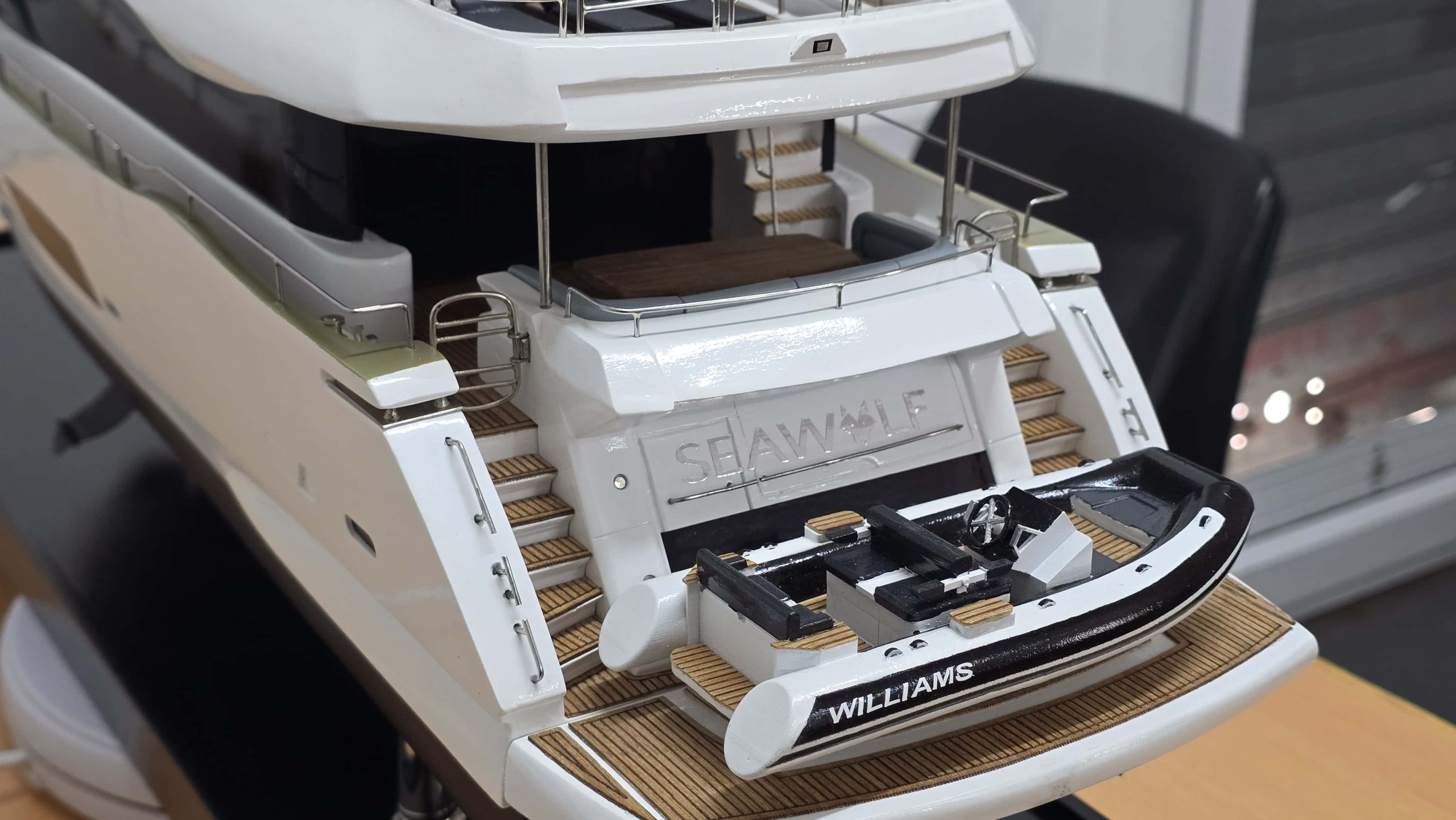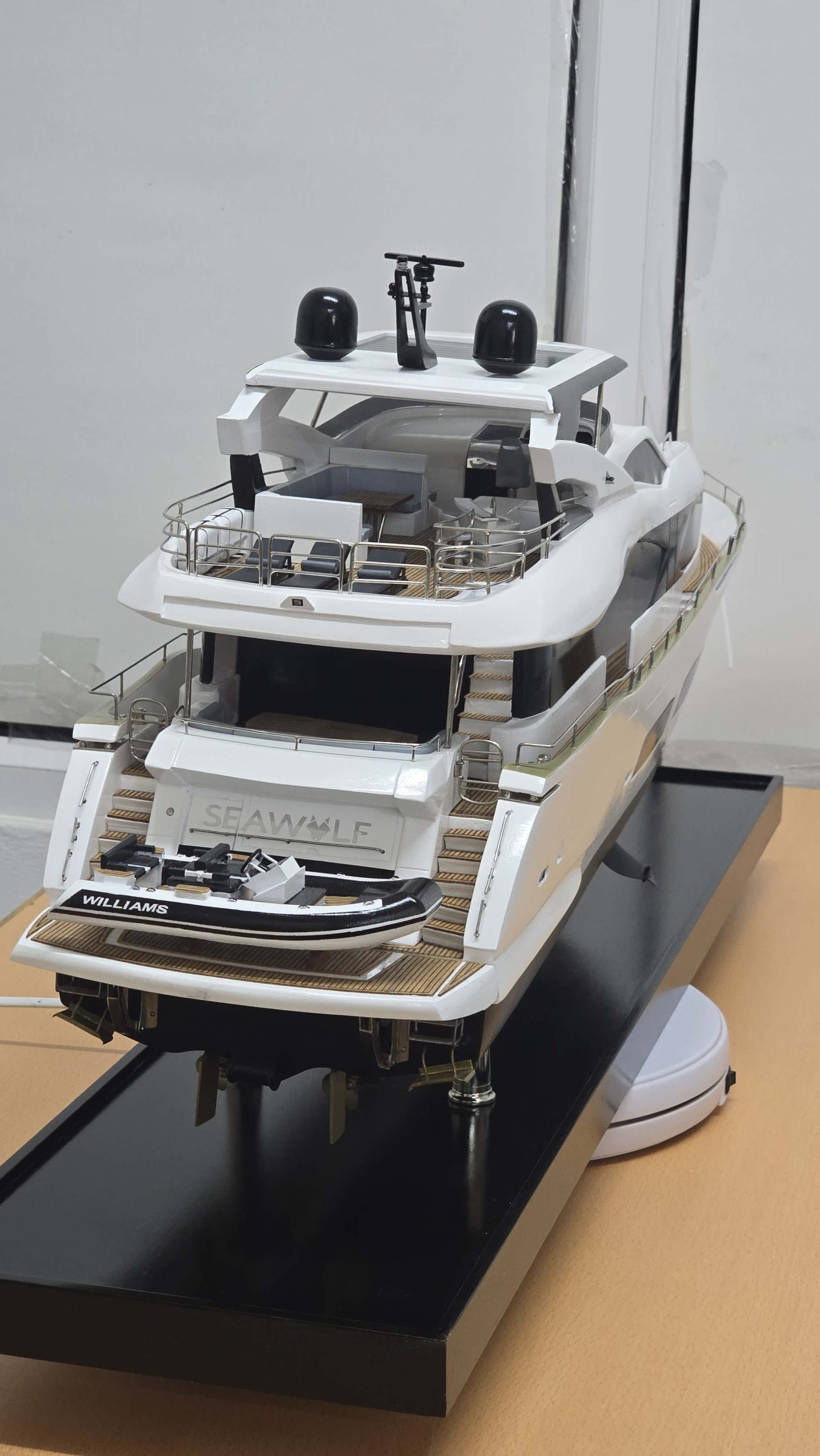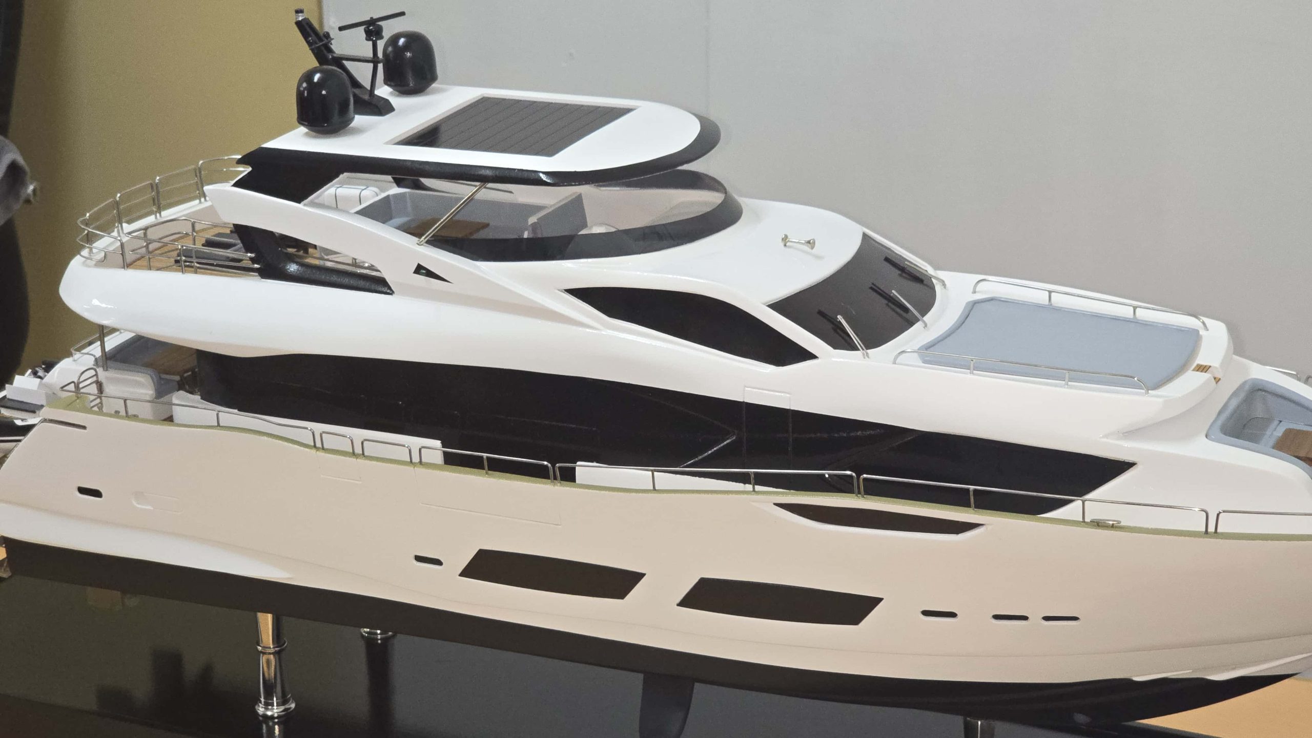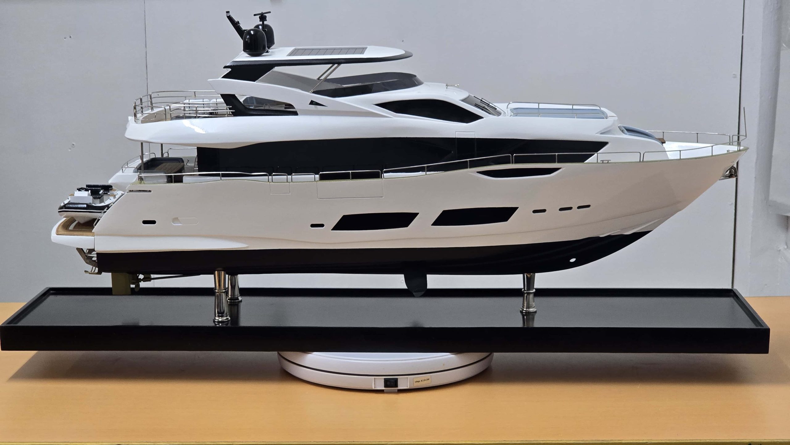The bespoke Sunseeker 95 model was created primarily using 3D-printing techniques, complemented by fibreglass and acrylic components and finished with chrome highlights, reflecting a high level of technical skill, creativity and precision.