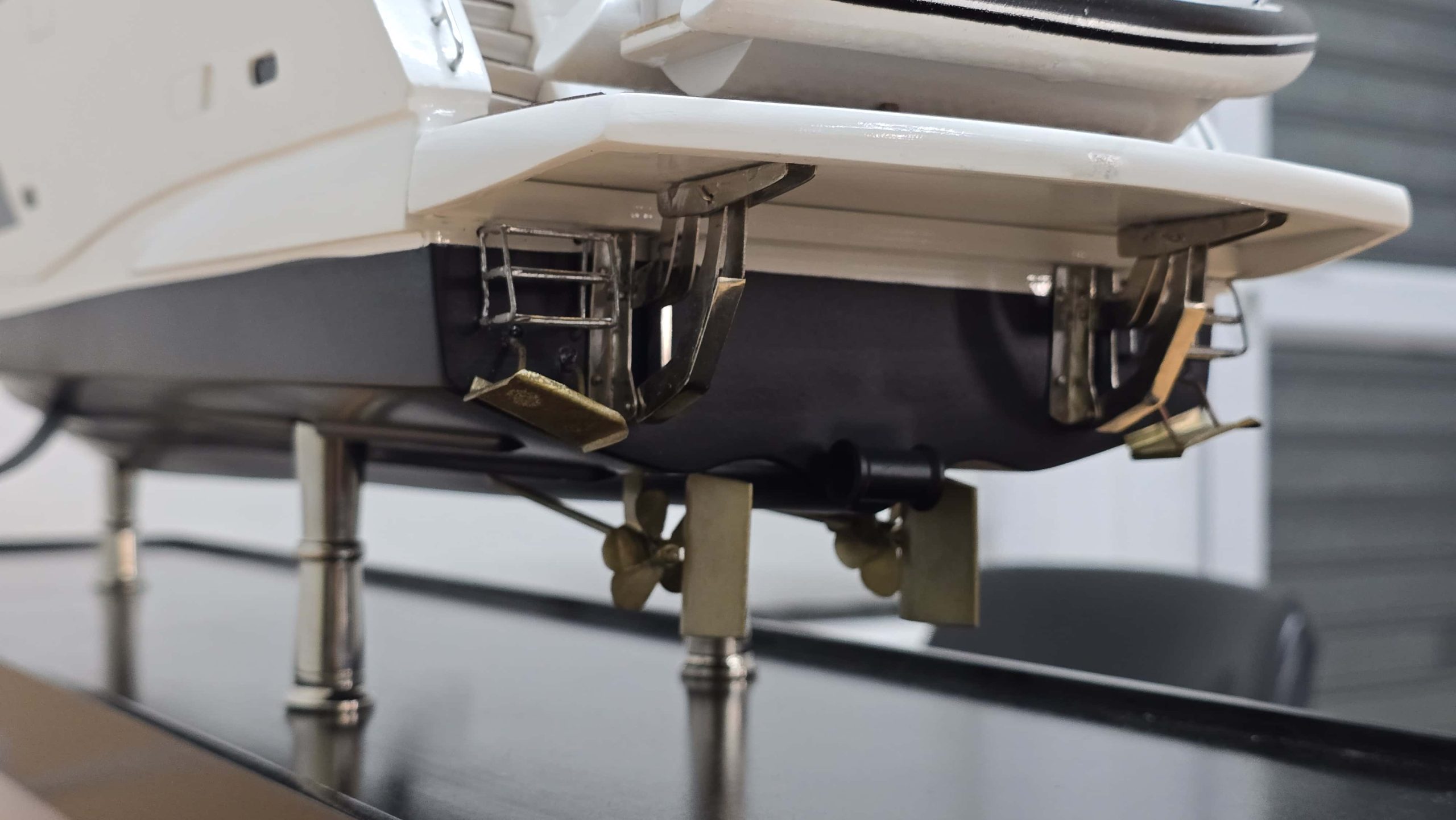 The painting stage was carried out with great attention to detail to achieve a flawless, high-end finish. The lower hull was coated in a sharp black, while the upper surfaces were finished in a clean, elegant white. To complete the process, the entire model was carefully cleaned and polished to a high gloss, with the RHIB also receiving its own finishing touches.