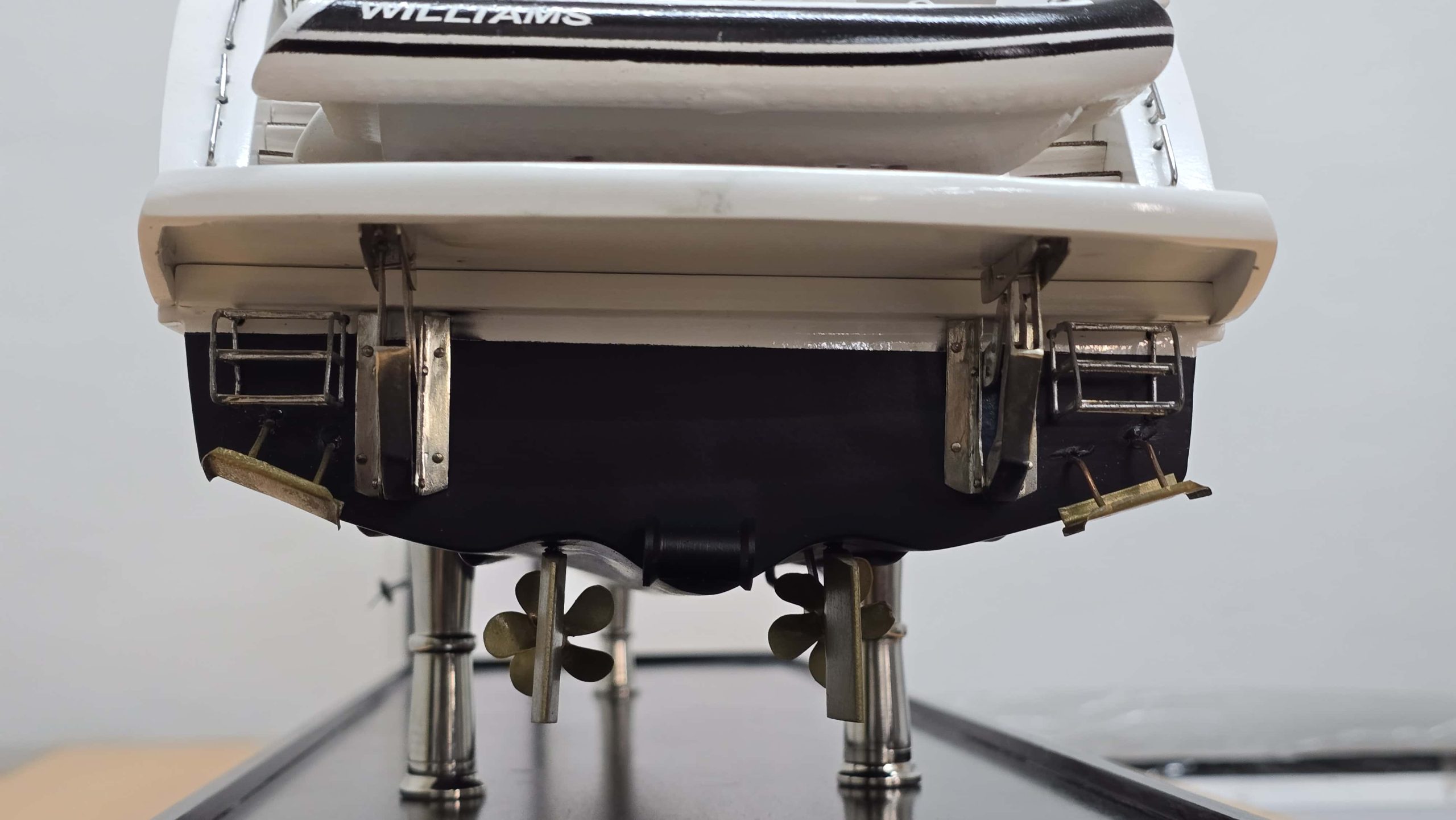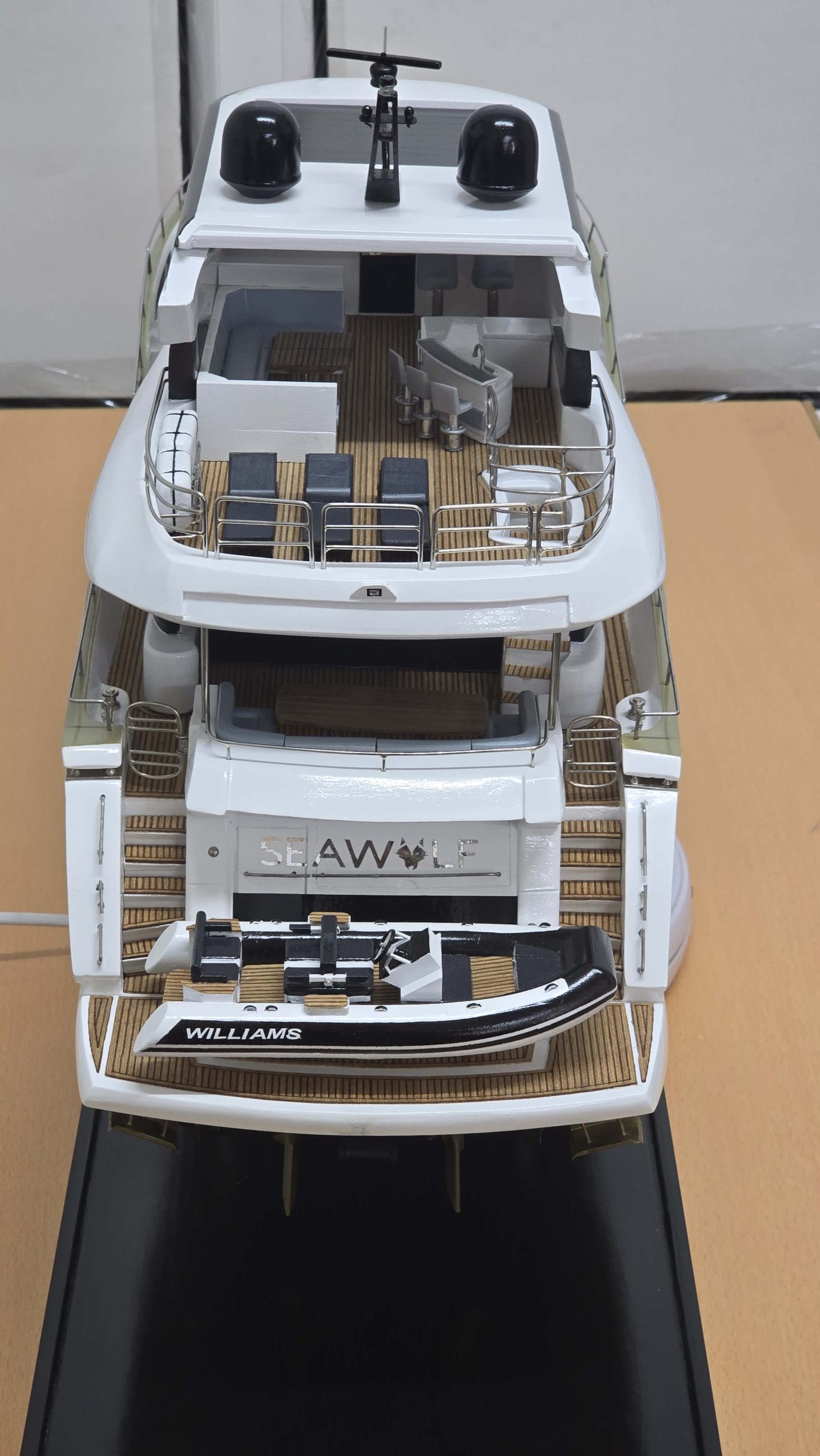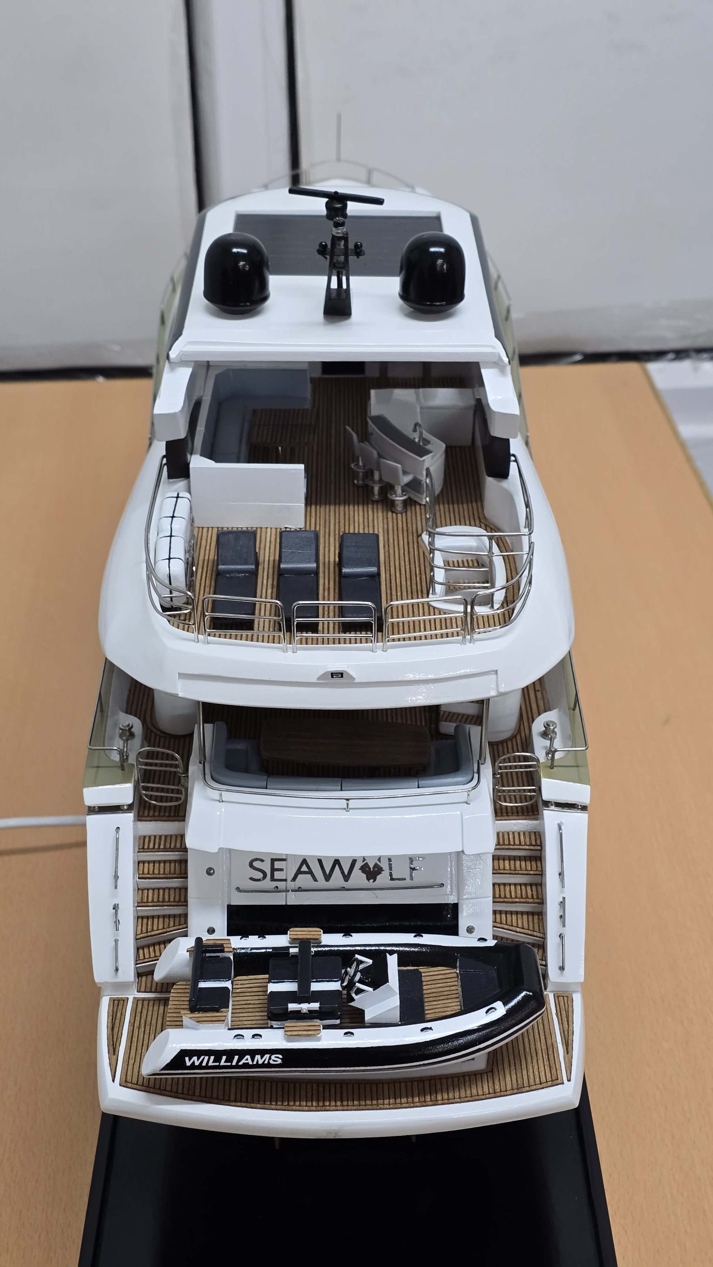 Construction started with the hull, which forms the main structural base of the model. This stage required careful measurement and expert workmanship to accurately replicate the proportions of the full-size yacht. Once completed, attention moved to the upper sections, including the decks, darkened windows, aerials and the small RHIB positioned at the stern.