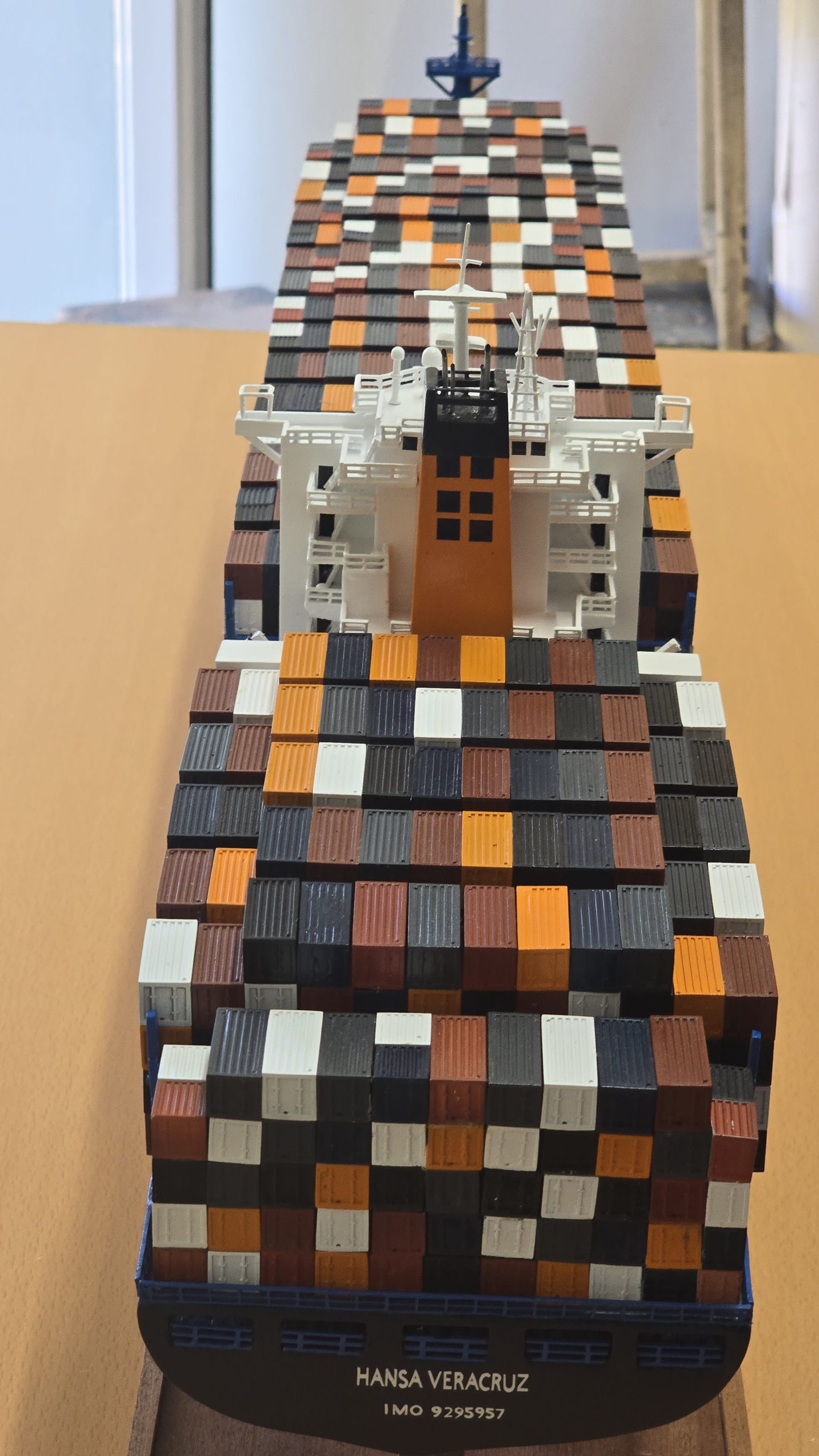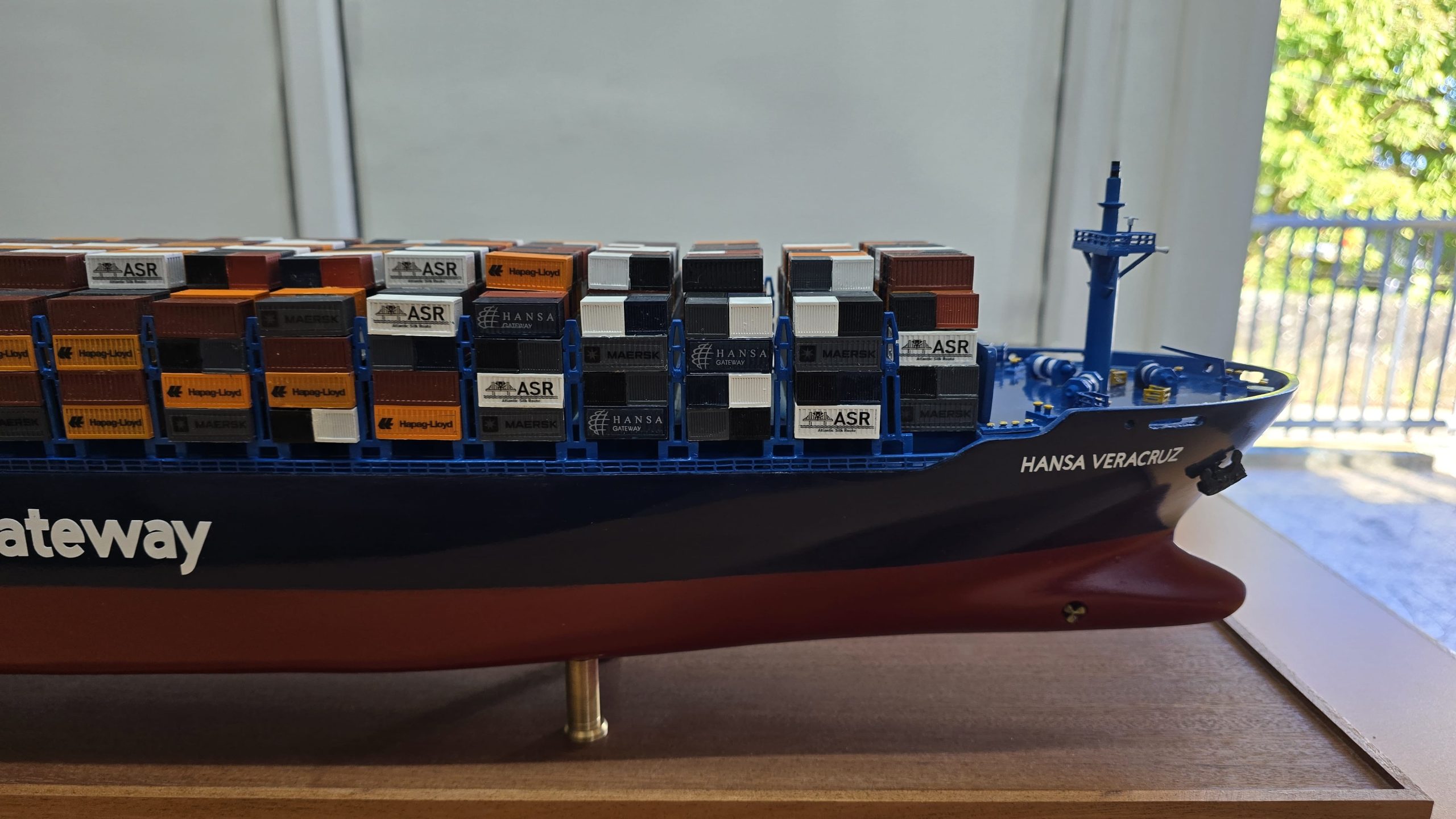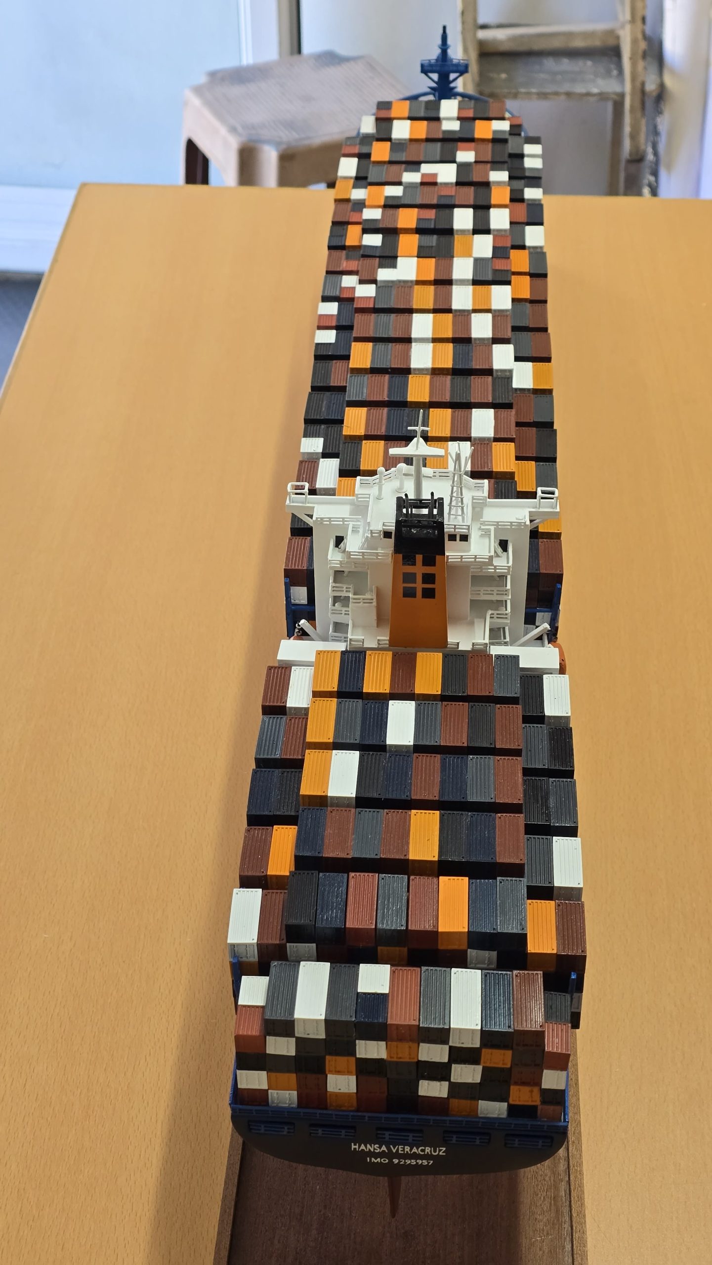 La phase de peinture a été réalisée avec une grande attention aux détails afin d’obtenir une finition impeccable et haut de gamme. La partie inférieure de la coque du Chacabuco a été peinte en rouge foncé, avec une finition bleu marine pour la majeure partie du modèle, créant ainsi un contraste saisissant. Des décalcomanies Hansa Gateway ont été ajoutées pour plus de réalisme, et les conteneurs individuels ont été colorés afin d’égayer le modèle. À l’arrière, l’inscription « Hansa Veracruz » a été apposée au-dessus de l’IMO.