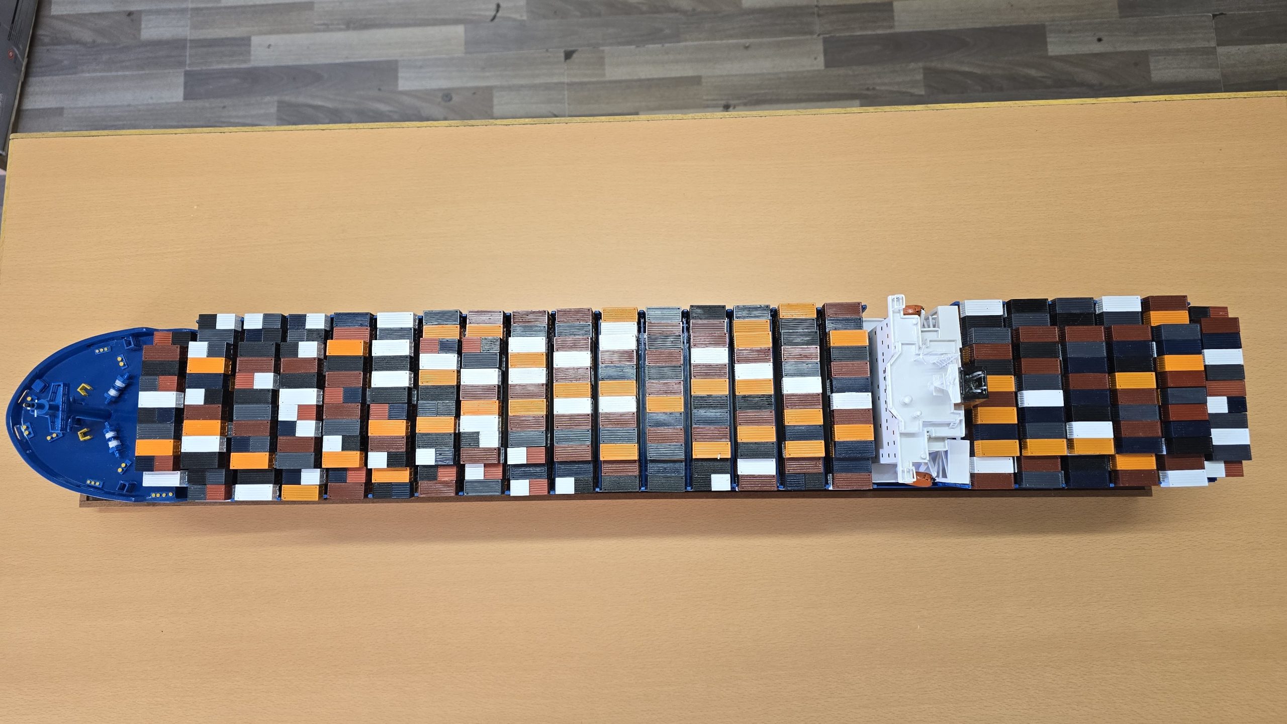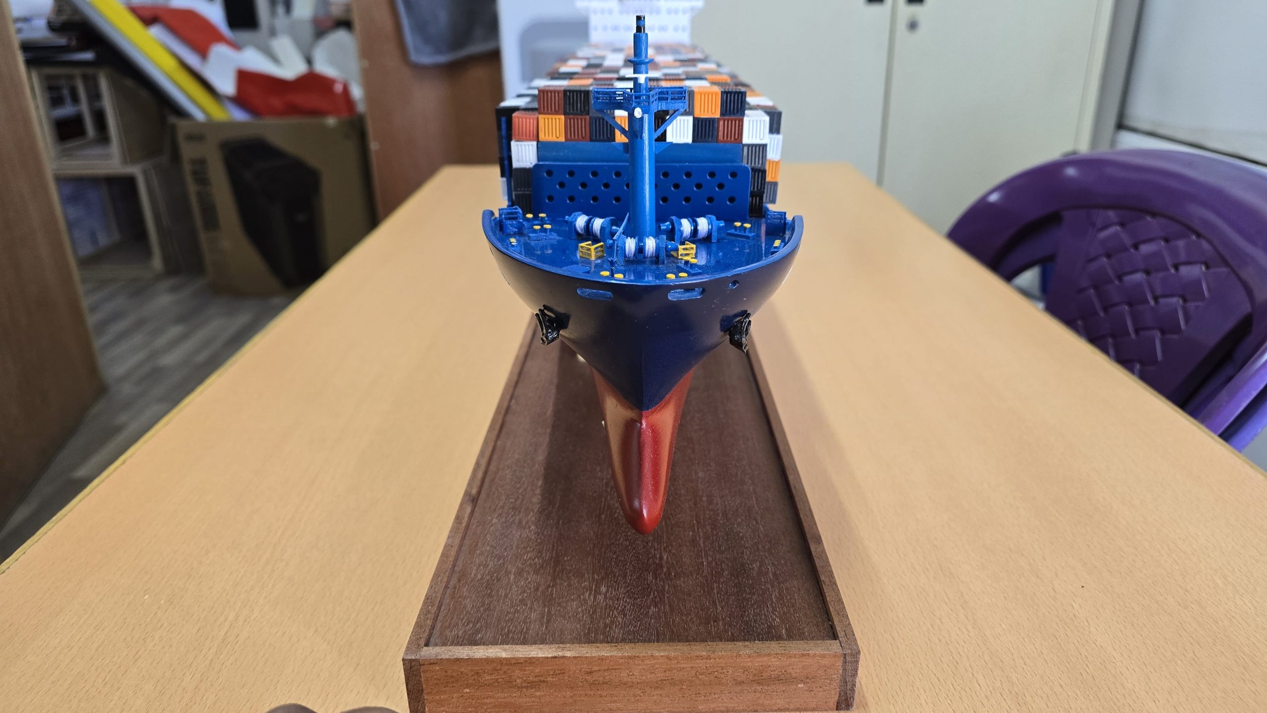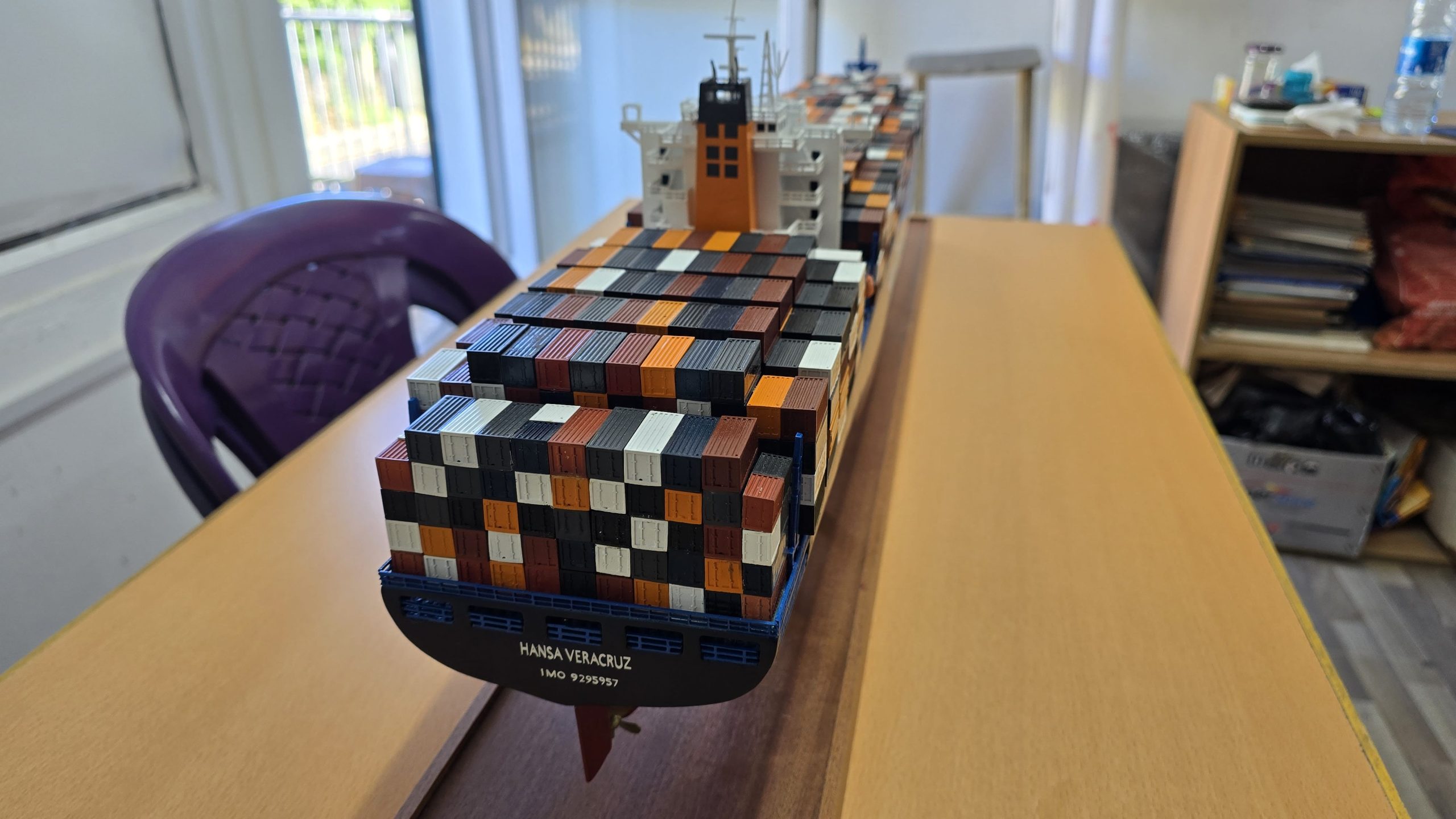 La phase de peinture a été réalisée avec une grande attention aux détails afin d’obtenir une finition impeccable et haut de gamme. La partie inférieure de la coque du Chacabuco a été peinte en rouge foncé, avec une finition bleu marine pour la majeure partie du modèle, créant ainsi un contraste saisissant. Des décalcomanies Hansa Gateway ont été ajoutées pour plus de réalisme, et les conteneurs individuels ont été colorés afin d’égayer le modèle. À l’arrière, l’inscription « Hansa Veracruz » a été apposée au-dessus de l’IMO.